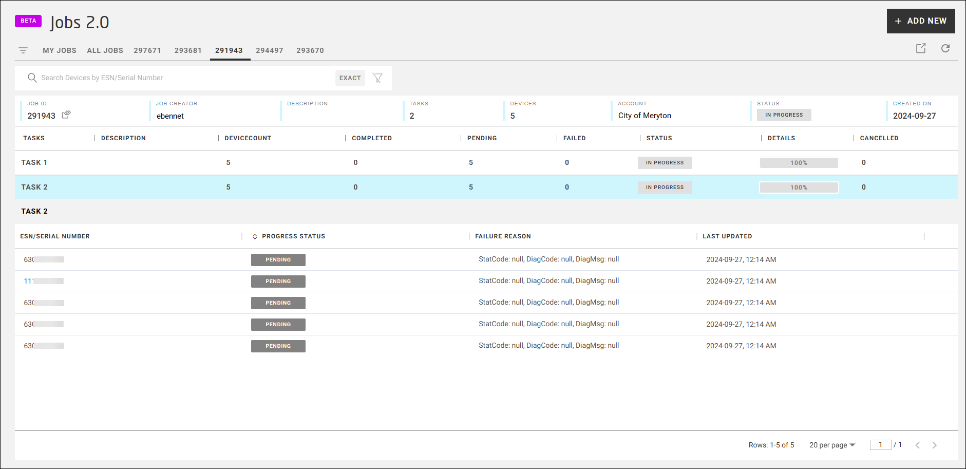 - Viewing details for multiple jobs side by side: You can now click a job ID to open the job's details on a new tab. Each task's information will be listed in its own row; when you select a task, the status of each file on the devices will be displayed.