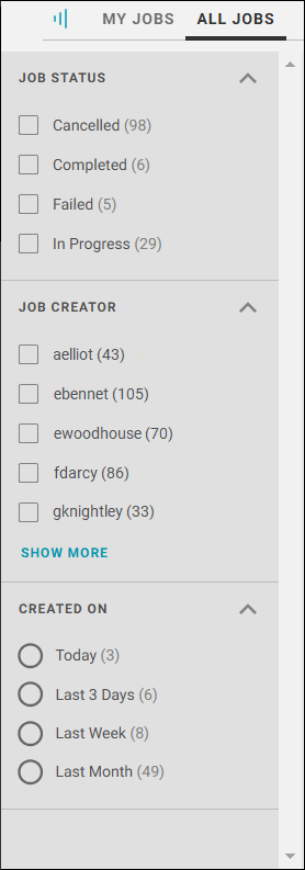 at the top left of the grid to expand a filter pane with three sections: Job Status, Job Creator, and Created On. In each area, you can select a check box to show only results that match that criteria, based on the status of your jobs, which user created the job, and the day the job was created, respectively.